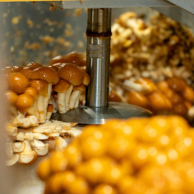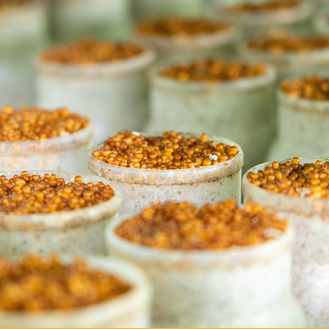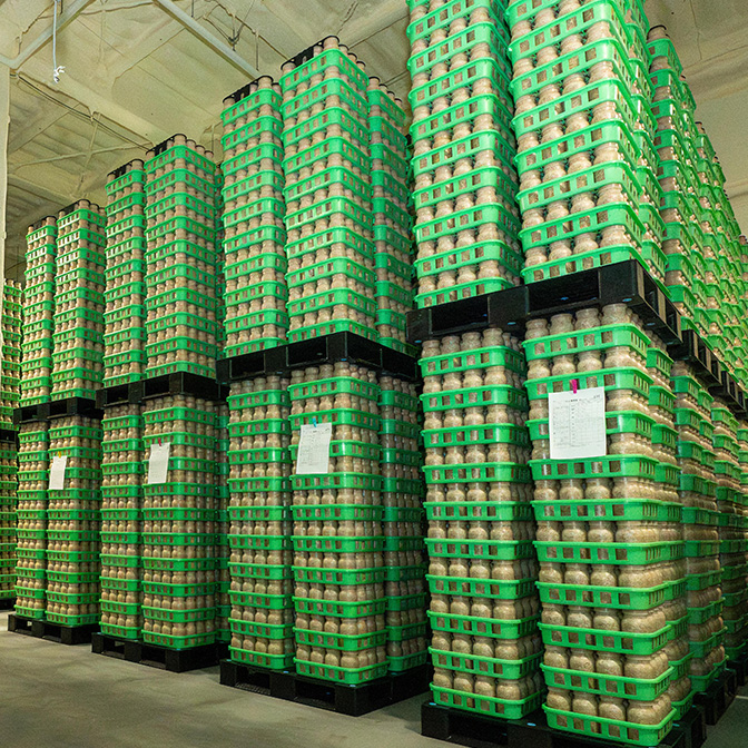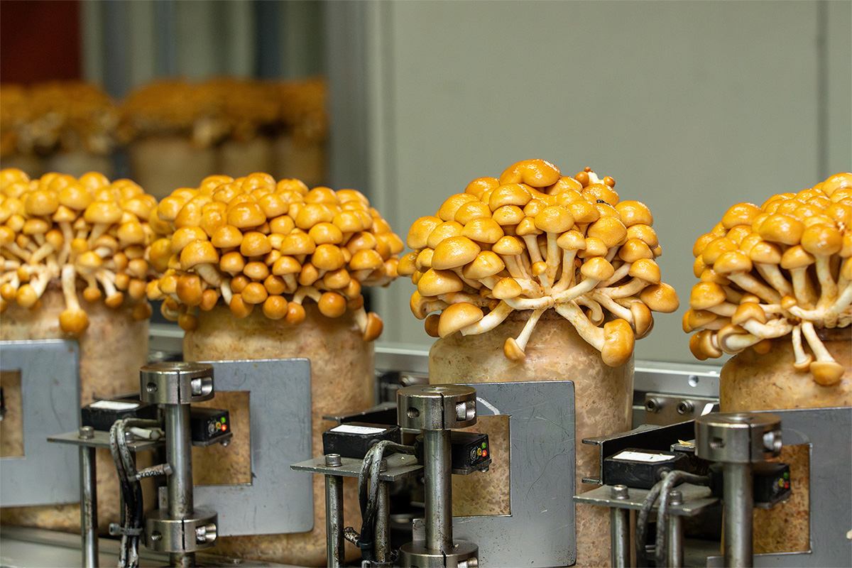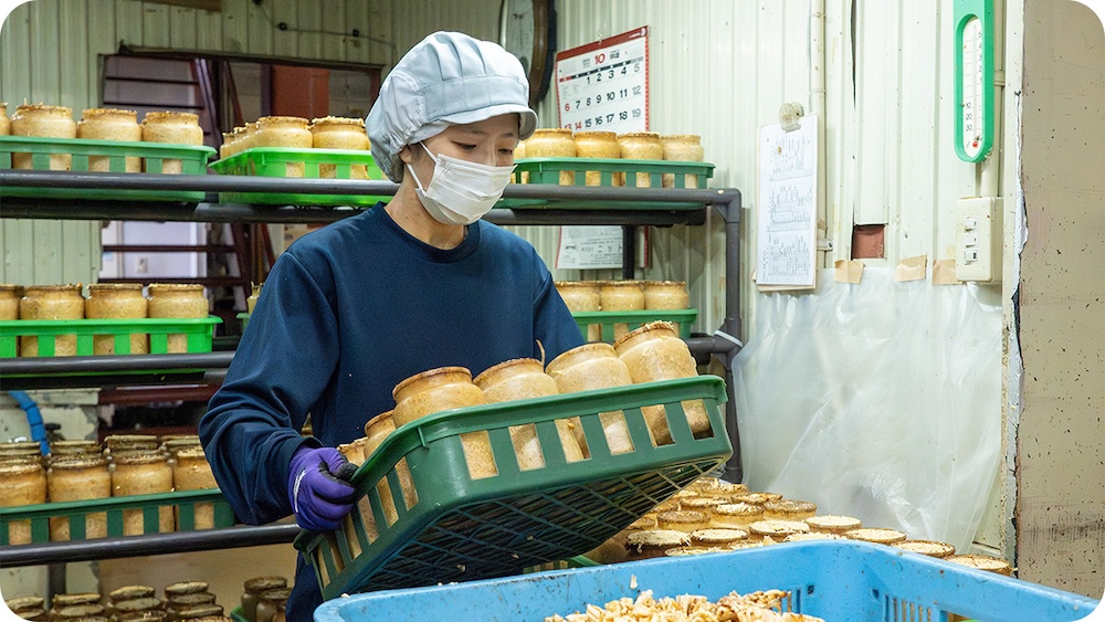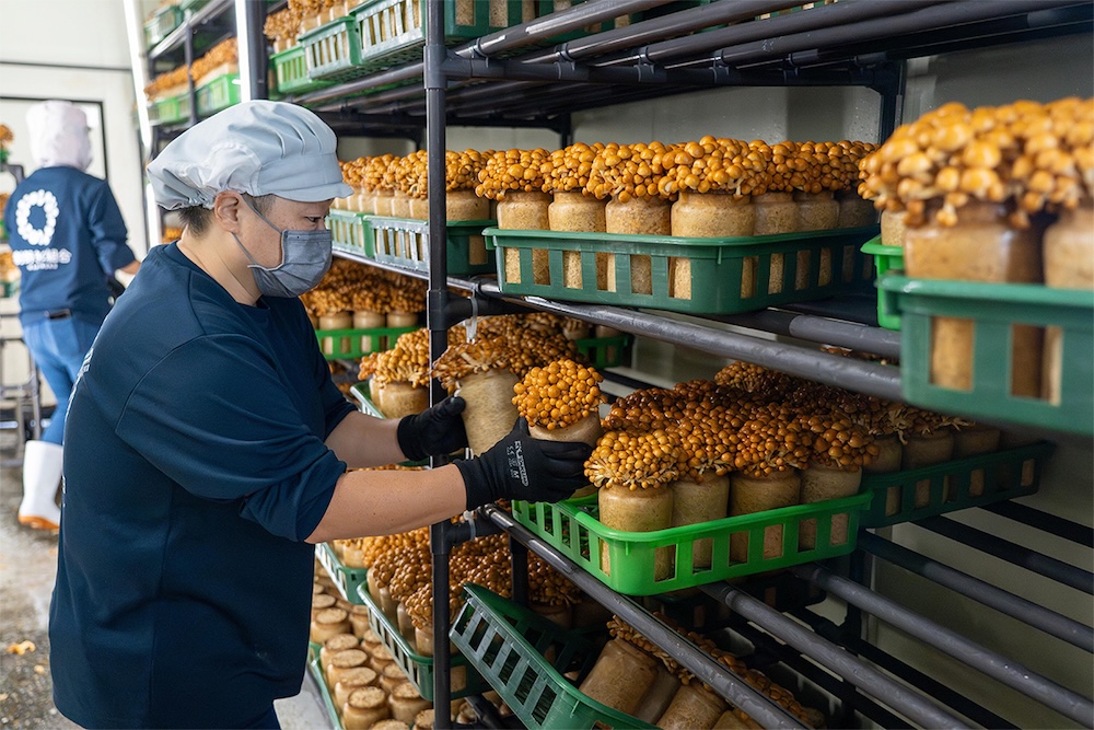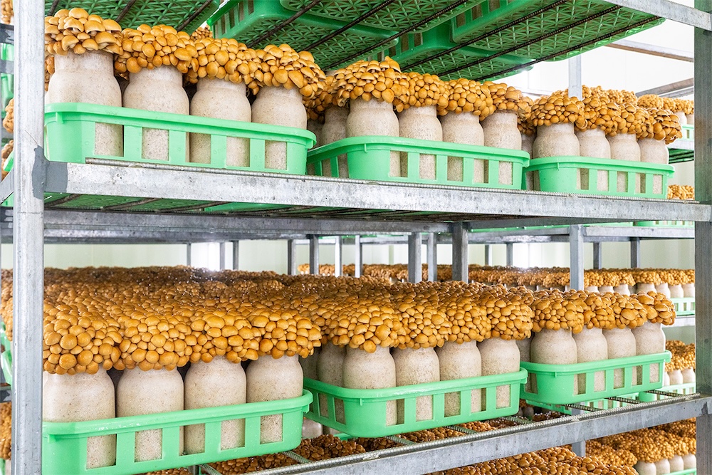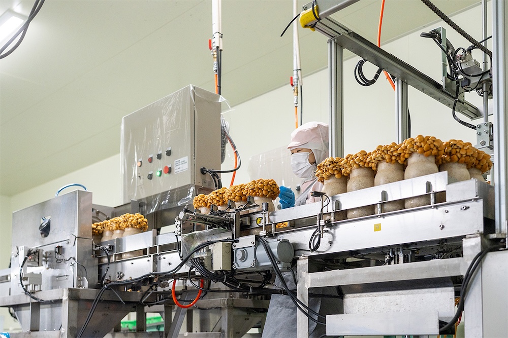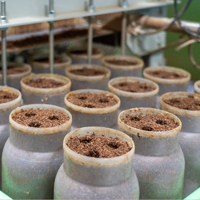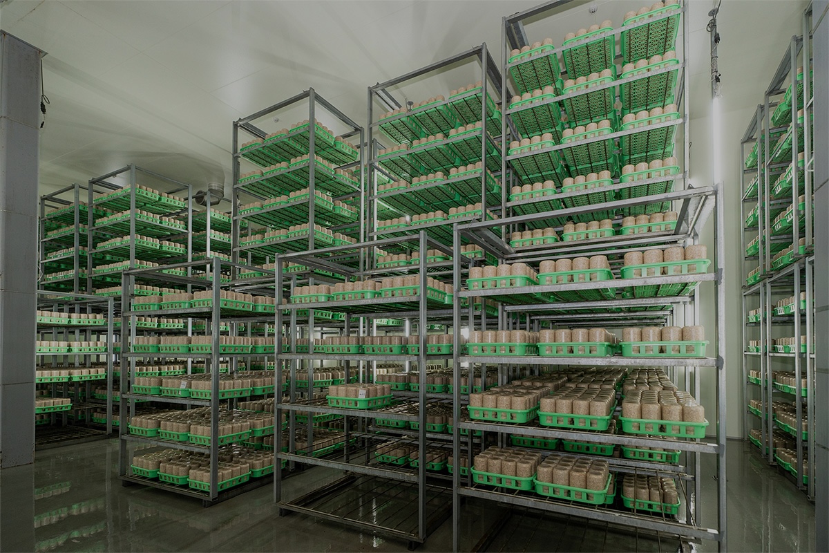 温度湿度管理された培養室で菌を瓶の中いっぱいに育てます。