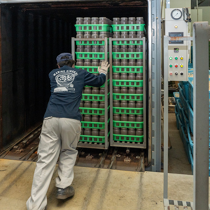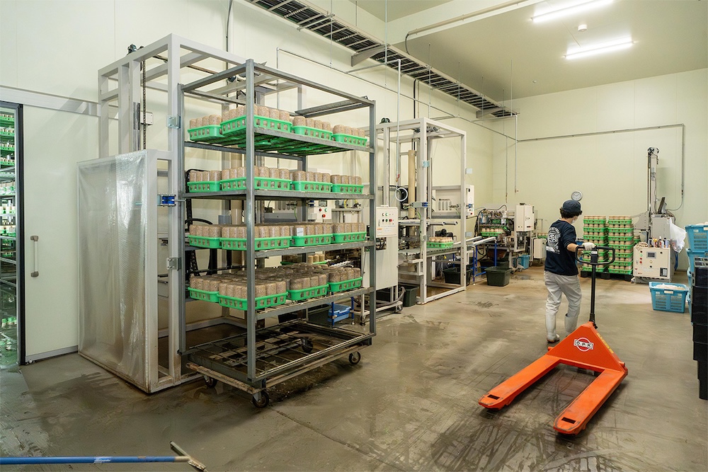 栽培瓶内の余計な菌をなくすため、高圧の殺菌釜で殺菌します。